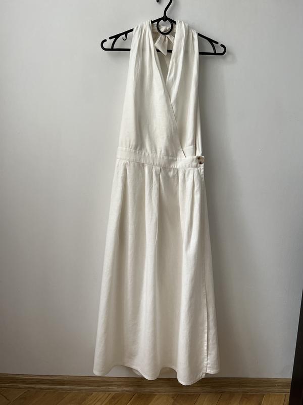 Сукня H&M Розмір - 42EUR Півоб грудей 46см, талії 37см, ззаду резинка, тягнеться до 42см. Можна перешити ґудзик спереду, щоб збільшити талію. В стегнах вільне. Довжина від плеча 117см. Спереду не світиться, ззаду під бежеві трусики світитись не буде, білі і інші буде видно. В живу красиве і дуже гарно сідає, на фото не передає. Є маленький недолік, перешивала ґудзик, зменшувала талію і лишились не значні сліди, яких майже не видно. Фото додала