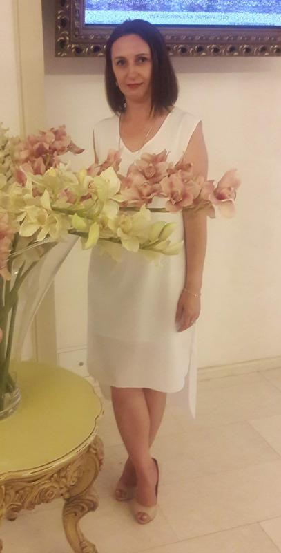 Белое платье без рукавов, на подкладке. Сзади удлиненная. Материал: полиэстер. Подойдет на размер М. Замеры: пог 48см, пот 46см, пост 50см, длина в первую очередь 92см.