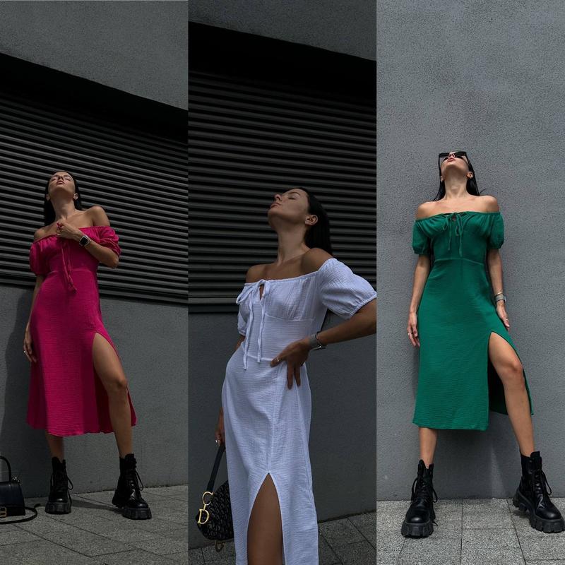 Модель: 1442 ▪️Тканина: муслін бавовна ▪️Розмір: 42-44 та 46-48 ▪️Колір : білий, малиновий, зелений 💬Неймовірно жіночна сукня міді з розрізом та ефектним бюстом💔 Натуральна дихаюча тканина. ФОТО РЕАЛ