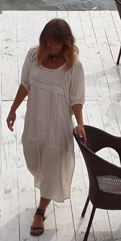 Легкое, невесомое платье в стиле бохо. Длина - 116, на объем груди не более 88, талия завышенная, где вшит поясок - 46, ширина юбки в бедрах - 60, рукав нестандартного кроя - 35. полностью из тонесенького чуточку жатого хлопка