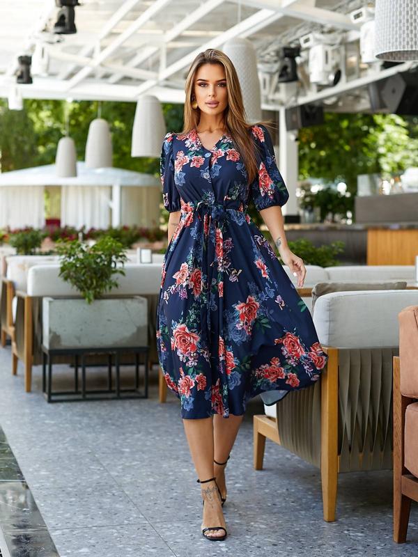 Платье миди летнее миди софт длинное цветочный принт на пуговицах с рукавами