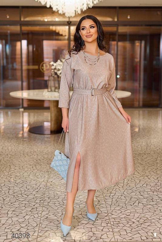 Платье миди больших размеров. Тканина: трикотаж. Пояс у комплекті. Ориентировочные замеры по готовому изделию: 50-52 (ог-114,от-70/110,ос-146,длина-128,рукав-56), 54-56 (ог-124,от-79/140,ос-154,длина-131,рукав-60), 58-60 (ог-134,от-86/146,длина-136, кофей-60)