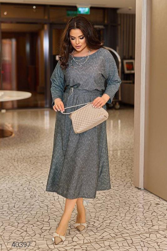 Платье миди больших размеров. Тканина: трикотаж. Пояс у комплекті. Ориентировочные замеры по готовому изделию: 50-52 (ог-114,от-70/110,ос-146,длина-128,рукав-56), 54-56 (ог-124,от-79/140,ос-154,длина-131,рукав-60), 58-60 (ог-134,от-86/146,длина-136, кофей-60)