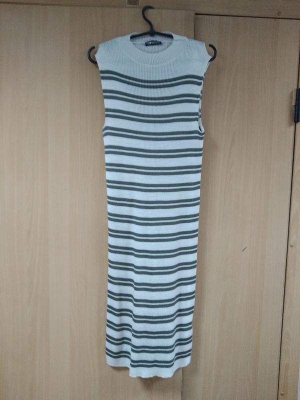 Рефленчатое платье в полоску,молочного цвета в полоску хаки.Обхват 80+,длина 107,прямое.Новое,без бумажной этикетки.