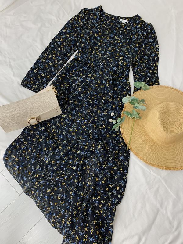 Медное платье в цветочный принт warehouse Размер 8 Квадратный вырез Разрез на ножке Красивый пояс Цена 750 Пог 44, пот 37, поб 51, длина 126 Вискоза