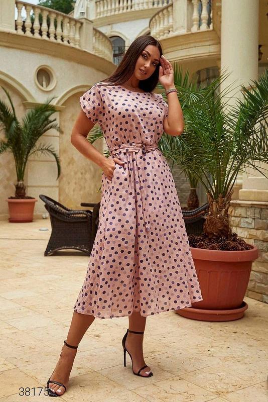 Легкое летнее платье в горошек. На талии резинка, пояс в комплекте. Снизу платья разрез с пуговицами. Гудзики не рабочие. Ориентировочные замеры по готовому изделию: 50-52 (ог-112, вот-78/110, об-140, длина-130, длина рукава-25), 54-56 (ог-120, вот-80/112, об-150, длина-134, длина рукава-27)