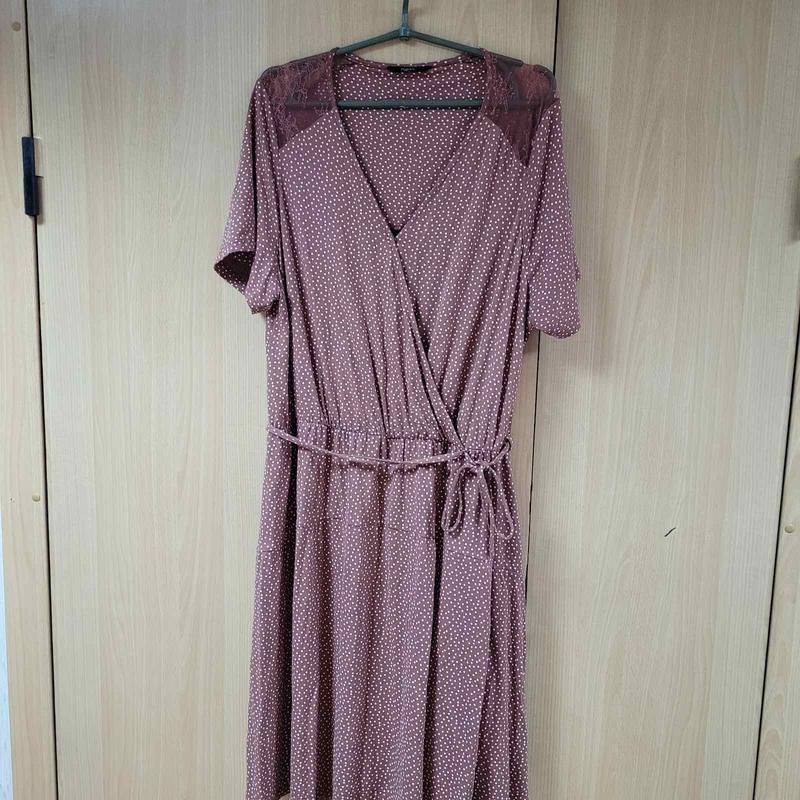 Трикотажное платье с запахом большого размера,талия на резинке с поясом.На плечах кружево.Светло-коричневое с белым горошком Ог 120+, талия 90+,Об 152+, длина 102.Новое, без бумажной этикетки.