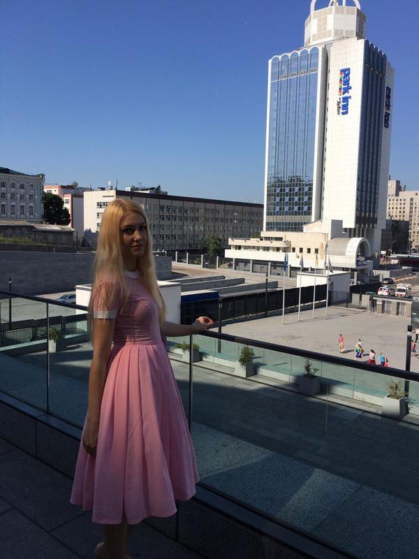 Нежно розовое платье в ретро стиле хлопковая нижняя юбка к телу, сверху фатиновая. Воротничок и манжеты из белоснежного атласа. Очень эффектно смотрится. Размер xs-s