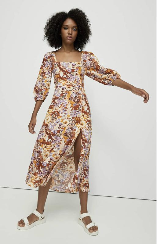 Вискозное платье stradivarius с разрезом в цветочный принт размер м-л стиль бохо