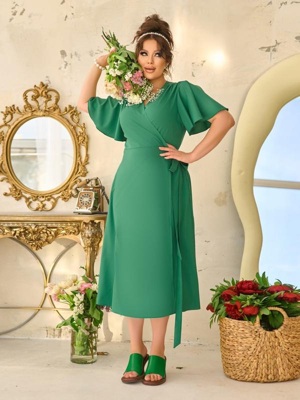 Платье-миди на запах. Изделие отрезано по линии талии. З короткими рукавами "крильце". Завязывается на вшитый пояс. Размер:46-48,50-52, 54-56, 58-60, 62-64, 66-68 длина изделия – 125 см длина рукава (от плечевого шва) – 24 см. Состав: 100% полиэстер Цвет: фиолетовый,черный, зеленый, пудровый, синий, бежевый Материал: софт Детали: отрезное по талии арт90653