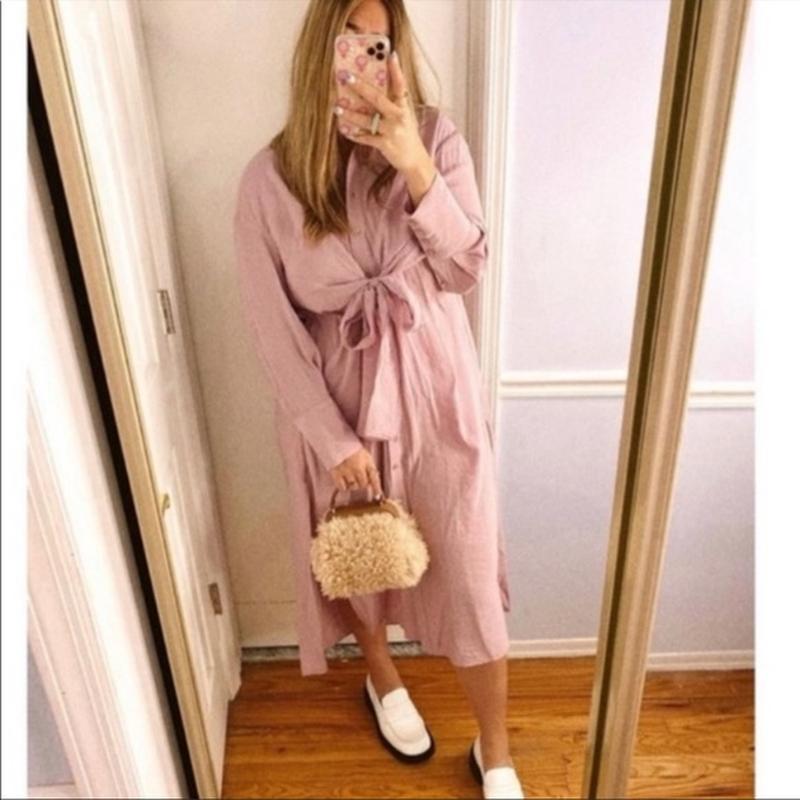 Платье рубашка женское миди с длинным рукавом с завязками бант в свободном стиле в красивый нежный лавандовый цвет очень стильное приятное к телу 83% modal (вискоза) 17% polyester новое с бирками в наличии Л размер пог 61см поб 66см плечи 59см рукав 53см длина 1.25см