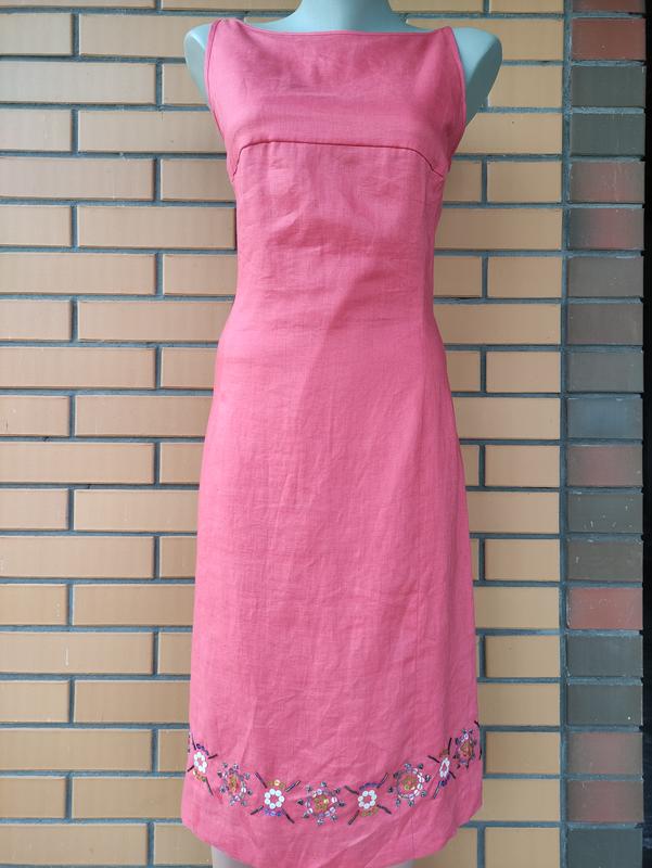 Лен, подкладка полиэстер, не тянется. По низу вышивка пайетками и бисером. Нова без етикетки Размер 40 наш примерно 46 -----длина 100 -----ОГ 94-96 -----ОТ 80 -----ОС 100