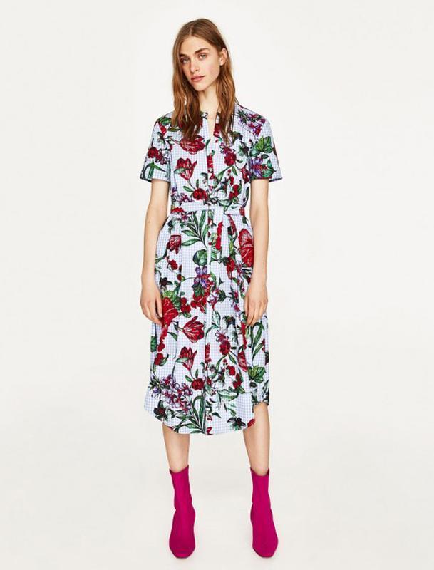 Натуральное хлопковое платье рубашка с поясом в цветы zara Свободный крой, застежка на пуговицы и пояс. Сплошной цветочный принт. Есть карманы. без бумажной бирки размер М плечи 42 пог 50 поб 59 длина 119
