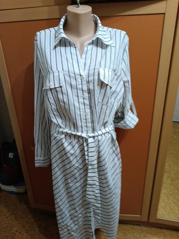 пошил халатом, размир 48-50, колir-р Белый в полоску синюю, замиры: длина 112, плечи 45,грудь60, талия 59,бедра68, ниже клеш, длина седя до талии 47,рукав длина 61, Ножно подвернуть эстмибка, Новое не одевалось сток, пролежало простернути, е пасик