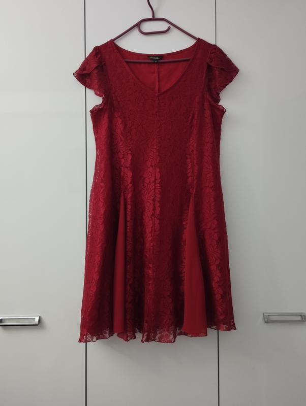 Сукня червоного кольору з мережива, крою трапеція, по спідниці є шифонові вставки, підкладка за натуральної тканини. Орієнтуйтесь на заміри. Плечі 38 ПГ 50 ПТ 48 ПБ максимально до 62 Рукав 12 Довжина 98