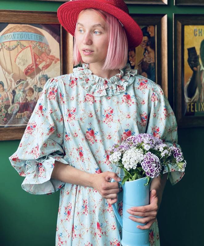 Нежное голубое платье с пышными рукавами и цветочным принтом в винтажном стиле