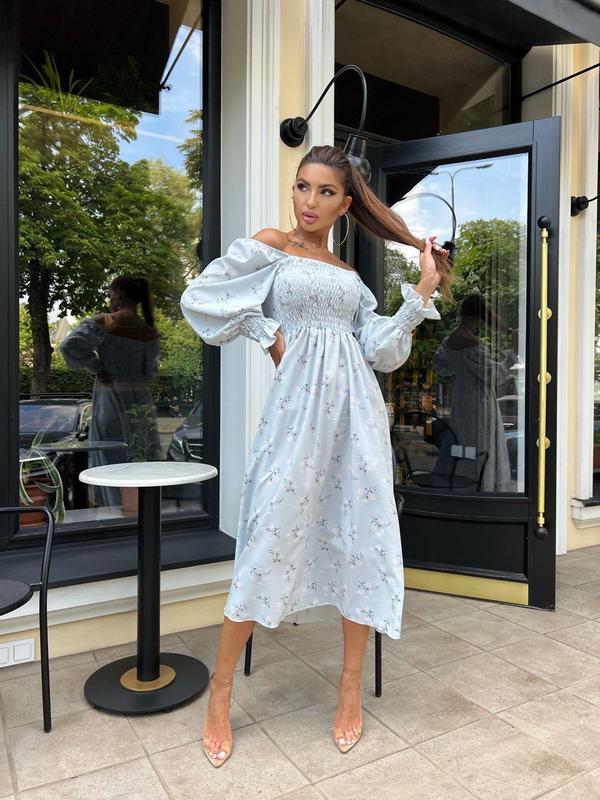 Платье миди в цветочний принт с длинными пышными рукавами фонариками с лифом на резинке ко...