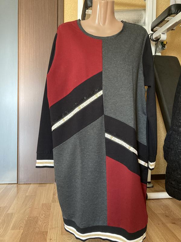 Сукня, виробник Турції,прямого силуету, знизу та на рукавах трикотажні манжети. Рукава та спинка чорного кольору, перед вставки бардо, темно- сірого, чорного кольорів, стрази на люрексова вставка. Ця сукня стане вашою любімицею! Доброго вам дня! Зараз Плечі. 43-44 Під пахвами 56-57 ПОБ. 56 Довжина від горловини 99 Рукав. 62