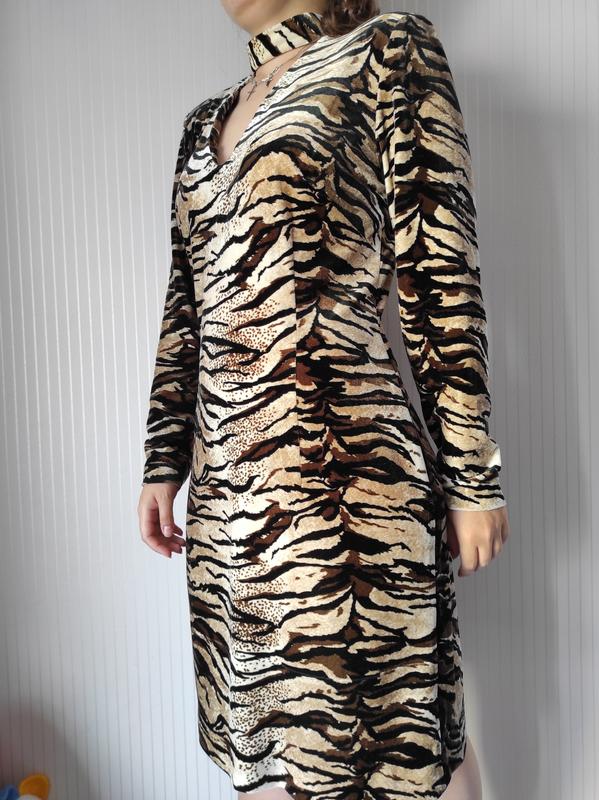 Бархатное платье миди с чокером с тигровым принтом. Размер 40, наш 50-52, хорошо тянется, очень приятная к телу. Длина 100, длина рукава 62, плечи 42-44, ПОГ 54-56, ПИТ 43-45, ПОБОДЫ 55-57, низ ~60 см. Стан идеален!