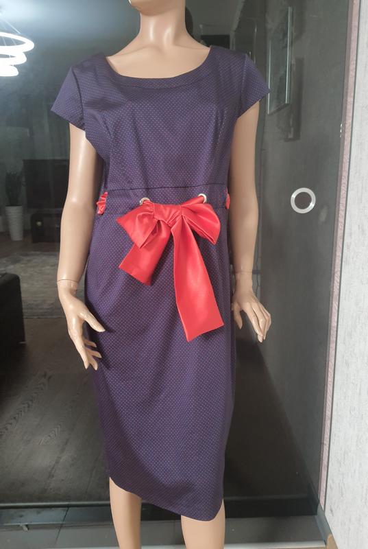 Новое платье Турция. Фасон силуэтный, отличное лекало-струнит. На голубом фоне мелкий красный горошек, впереди атласный бант. При желании можно бант из центра перенести через люверсы в сторону. Сзади есть небольшой разрез-шлица. В наличии только два размера 46 и 48 +6 на укр. Кашлось 2650 грн., сделано скинию. Заходите на мою страницу (много интересного).