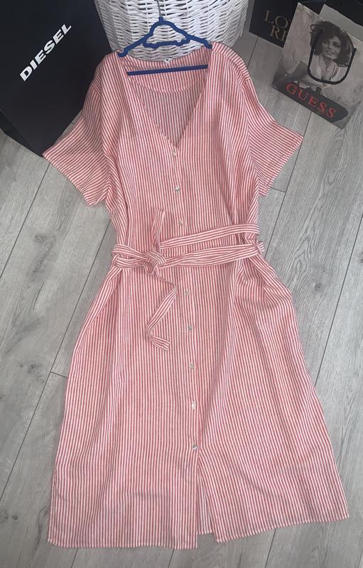 Hema Сукня з сумішевого льону 55/45-льон/віскоза По боках невеликі розрізи Має довгий пасок Можна носити в різних варіаціях Ідеальний стан без недоліків та слідів вживання Розмір хл Відстань між пахвами-58 Пот-58 Пос-60 Довжина-109 Лляні кюлоти у смужку також в наявності