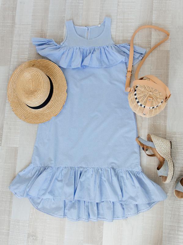 Сарафан у блакитну карту. Розмір С Стан новий. Зборку на грудях можна одягати як рукави, так і залишати під мишкою. Довжина спереду 97 см, по задній частині 107 см ОГ 90 ОБ 108