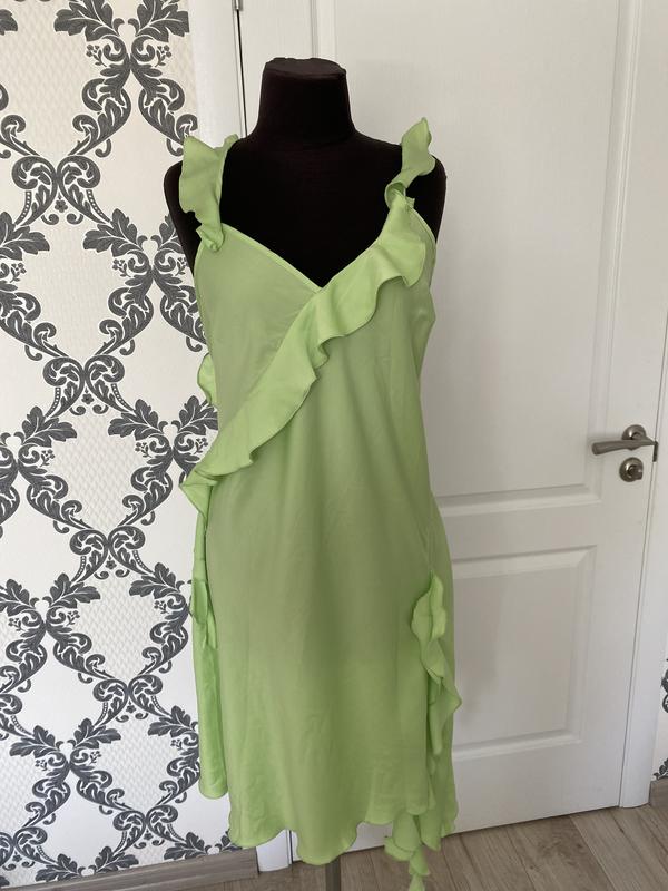 Хорошее платье миди с рюшами и разрезом сбоку салатное под сатин л 12 Длина без брителей 82 см Полуобхват груди 50 Талии 48-50 Стегон 57 Полиэстер