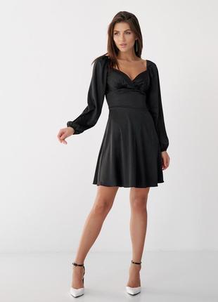 Сукня міні приталена по талії, спідниця - кльош, довжина вище коліна. Ліф пілочки з широким поясом та складками під лінією груді. Спинка із рельєфами, середня частина спинки зібрана резинкою. Рукава довгі, верхній крій рукава зібраний резинкою і служить бретелью. Низ рукава зібраний резинкою. Замовлення можна оформити через Вайбер Найбільший асортимент якісного жіночого одягу на нашому сайті ********** Розмір підбирайте відповідно таблиці: (також обов'язково враховуйте заміри виробу, що вказані в характеристиках товару)