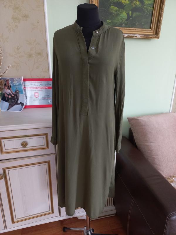 платье 100% вискоза, свободного кроя, цвет хаки, в идеальном состоянии, р-р XL, длина 103/113, длина рукава 60. торг