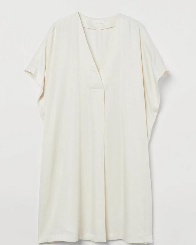 очень красивое и стильное платье свободного кроя H&M. Очень приятного молочного цвета. Стан - идеальный. В составе 46% вискозы. Размер М но за счет свободного кроя можно и больше. Замеры ПОГ 70 см длина 90 см