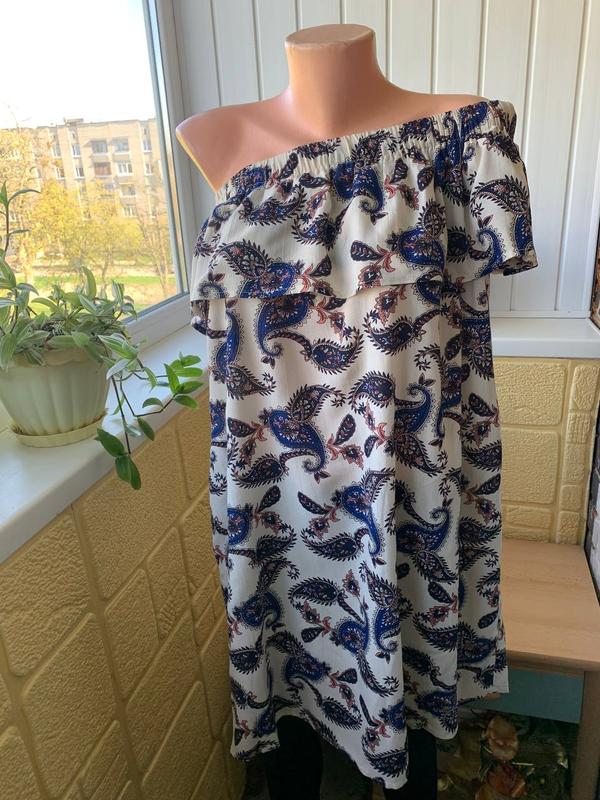 Предлагаю интересное летнее платье свободного кроя.Отличное качество.Веромый бренд.Доступная цена.Довжина-77 см.Тканка-вискоза..Верх платечка на резинке, можна регулировать.Размер 48-50.