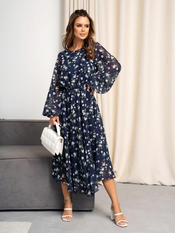 14130_синий Комбинированное платье из цветочного синего шифона с нижней подкладкой. Модель приталенного классического кроя с резинкой на талии. Модель с длиной миди и длинными объемными рукавами на резинках. Горловина закрытой О-образной формы на пуговице.