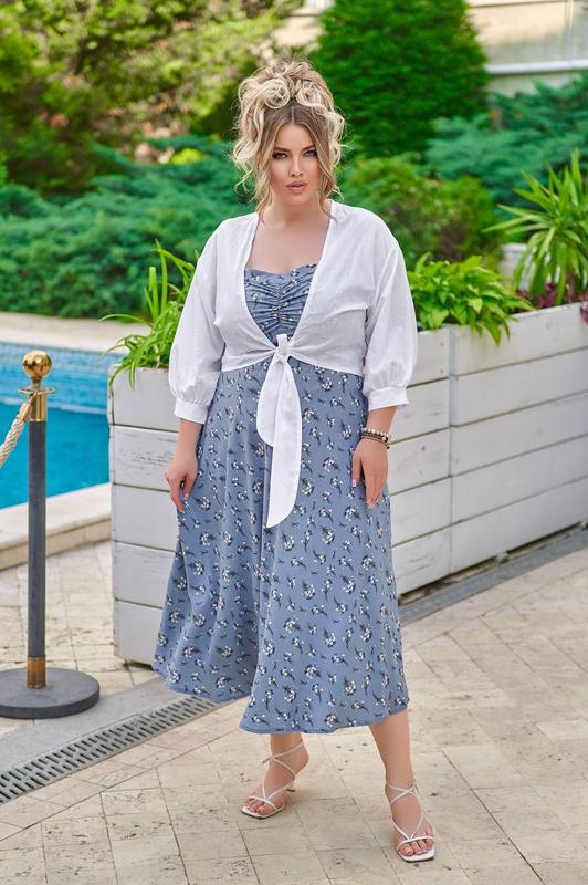 Тканина : батист ( біла сорочка), штапель ( плаття) Кольори плаття : джинс, бежевий, чорний Комплект плаття та сорочка, плаття нижче колін, на грудях збірка тканини, яка підкреслює груди, плаття на бретельках , які завʼязуються на плечах , регулюючи довжину ( по дві на плечах), ззаду на спинці ряд резинок , які регулюють обʼєм ( виконані на спецмашині). Сорочка з рукавом нижче ліктя на манжеті , з переду завʼязується ( без ґудзиків ) Параметри моделі 110-86-110, зріст 170см, на ній розмір 50-52 Параметри виробу : 46-48: ОГ44-100, ОТ82, ОС154см, довжина від «подмишки» 98см ; сорочка : довжина рукава 41см, по спинці 52см. 50-52: ОГ90- 110, ОТ88, ОС 162, довжина від «подмишки» 98см; сорочка : рукав 42см, довжина по спинці 52см; 54-56 : ОГ92-120, ОТ94, ОС170, довжина плаття від «подмишки» 99см; сорочка : рукав 43см, довжина по спинці 53см. 58-60: ОГ94-130, ОТ98, ОС178, довжина від «подмишки» 99см; сорочка : рукав 43см, довжина по спинці 53см