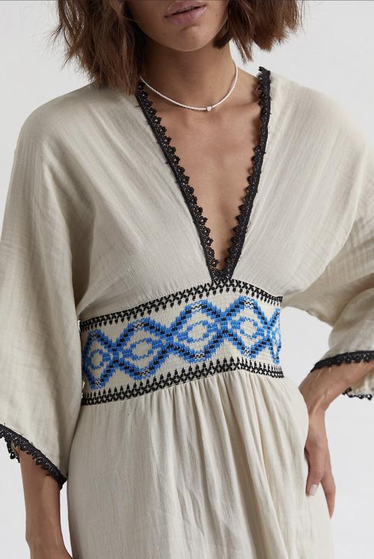 С таким красивым платьем в этническом стиле ты сможешь создавать стильные современные луки и для праздников, и каждый день. В модели талия по кругу собрана на множество тонких резинокочек, а передняя часть пояса украшена красивым узором в технике машинная гладь. В боковых швах вшит широкий пояс, фиксирующийся на спинке. Горловина у платья V-образная и спереди, и сзади. Широкие рукава средней длины по низу украшены кружевом, которое находится на горловине. Низ в изделии прямой, дополненный боковыми разрезами. 80% хлопок 20% полиэстрер параметры модели 84*60*92 рост 173