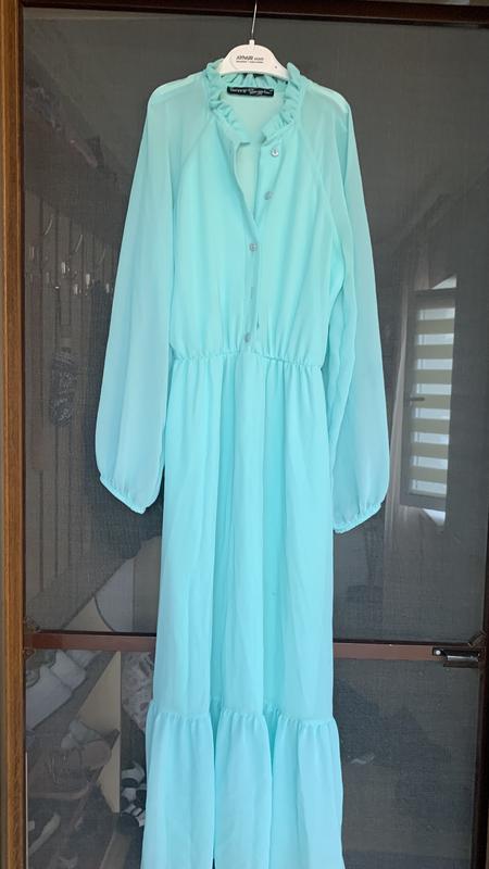 Платье миди нежного голубо-бирюзового цвета. Состояние хорошее,есть небольшое пятнышко,выводить не пробовала. Размер s