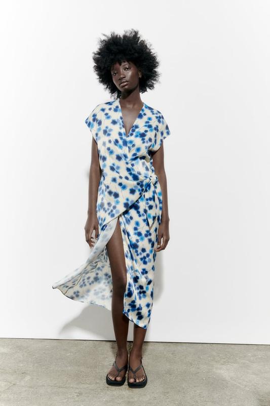 СУКНЯЯ НА ЗАПАХ С ПРИНТОМ Zara original Платье средней длины с V-образным вырезом и короткими рукавами. Запах, сборки и завязки из той же ткани спереди. Серовато-бежевый цвет ⁇ 2764/008 В наличии размер хs