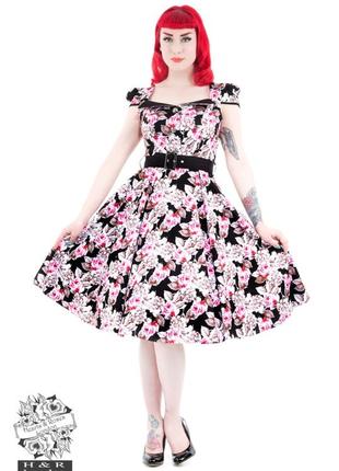 Додайте нотку вінтажності. Дизайн складається з яскравого квіткового принта на чорній еластичній бавовняній тканині. Чорно-рожева квіточка дійсно доповнює стиль. Ліф приталений, щоб зробити акцент на талії і пишній спідниці, а ліф також має пояс з чорною краваткою, що підкреслює талію. виріз у формі серця . Особливості сукні : Миле декольте Сукня опускається нижче коліна Укорочені рукави Потайна бічна блискавка Легка і м'яка тканина Склад матеріалу : 97хлопок, 3ластик