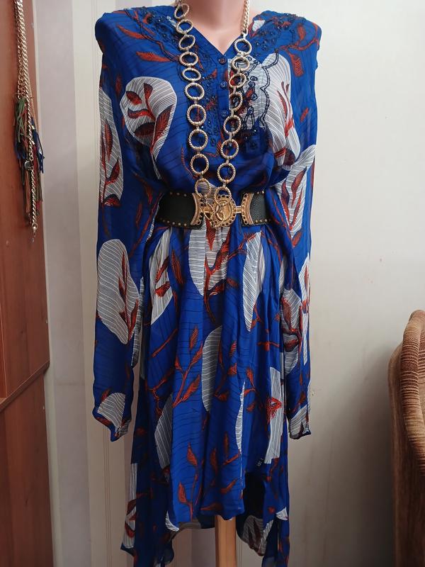 Супер рішення 2 в 1 ассіметрична сукня і довга сорочка туніка на вузлі ,правильна скроєна не світиться внизу , виглядає сложно по дизайнерські стан нової речі розм хл можна на л ххл , дивіться по вимірам довж 105 пл45 рук 66 підіймається трохи в ліхтарик пог 63 пот 60 поб 68