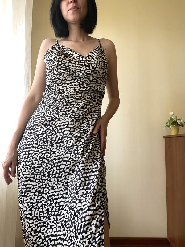 Сатиновое платье-миди в анималистичный принт New look, P-p UK 12 Новая, с биркой, но есть маркетинг в виде стрелочка- смотреть последние фото- в носке незаметно Длина 110 ПОГ 45 ПОТ 40 ПОС 48 💯 Полиэстер