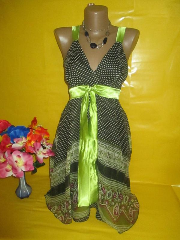 Лёгкое невесомое шифоновое летнее платьице-миди с яркими широкими блестящими атласными бретелями ( не регулируемыми ), спереди V-образным вырезом на запах, спинка на мелких резиночках ( до талии ), под грудью тоже украшено поясом-лентой из той же ткани, что и бретели, юбочка фасона "полу-солнце-клёш" с ажурным узором в виде вышивки, полностью платье на подкладе. Смотрится нежно, романтично, кокетливо и мило! Размер не указан, наш 44-46, замеры: длина вместе с бретелями 90 см, ОГ до 88-90 см, под грудью 32-33 см и + тянется, сзади резинки, ПОТ и ПОБ свободно. Ткань - верх лёгкий невесомый нежный шифон и подкладка 100% полиэстер, мягкая, приятная и отлично тянется. Спрашивайте, пожалуйста, на лето прекрасный вариант лёгкого не ощутимого на теле, платьица! Доставка УП ( "Стандарт" или "Экспресс" ) и НП, оплата за доставку при получении;-)...