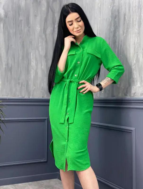 Также в наличии размеры 42-44, 46-48. Легкое и стильное платье-рубашка - идеальный наряд для современной модницы, независимо от стиля, возраста и фигуры.Завидки прямому крою и воздушной ткани изделие мягко облегает фигуру, подчеркивая ее достоинства. Особенности модели Характеристики платья "Marcella": - сезон – весна/лето; - ложные карманы на груди; - прямая планка с пуговицами; - отложной воротник; - длина платья - миди (нижние колени), длина рукава - 3⁄4, с отворотом; - материал – американский жатый креп. Съемный пояс из той же ткани, что и рубашка, позволяет сделать акцент на талии. Чтобы создать оригинальный образ, можно использовать тонкий кожаный ремешок вместо идущего в комплекте пояса. Платье-рубашка "Marcella" выполнено из американского жатого крепа. Ткань имеет мягкую шероховатую поверхность и интересную текстуру. Оригинальное переплетение нитей делает американский креп легким, но плотным. Благодаря этому платью аккуратно маскирует недостатки фигуры, но не теряет легкости и не утяжеляет образ. Платье из жатого крепа быстро сохнет и хорошо сохраняет форму и цвет после многочисленных стирок. Изделие рекомендуется стирать при низкой температуре (30-40 градусов). Если сушить платье в вертикальном положении, ему не нужно гладить Характеристики Стиль:Casual Сезон:Лето Длина по спинке:111 см Длина рукава:45 см Материал:Американский креп  Таблица размеров Наличие на складе Цвет50-52 Черный✓ Фрезовый✓ Графит✓ Зеленый✓ Капучино✓ ✓ — в наличии (количество не ограничено).