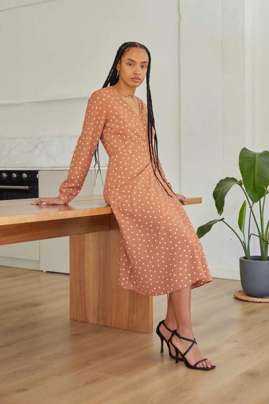 Базова сукня Uniqlo Идеально подходит для повседневного стиля, с ботинками и колготками или одевания с каблуками и аксессуарами. 100% полиэстер (приемный на ощупь, легкий в походе) - Текстурированная креповая ткань создает красивую драпировку. - Универсальный дизайн на запах адаптируется к любомутипу фигуры. - Элегантная завязка на талии, глубокий V-образный вырез и детали из собрания на плече. - С удобными карманами. - Шнурок внутри юбки позволяет закрепить внутренние слои на месте для комфорта и легкого движения. - Вечный принт в горошек. коричневая (с красивым пудрово-розовым подтоном), р.С