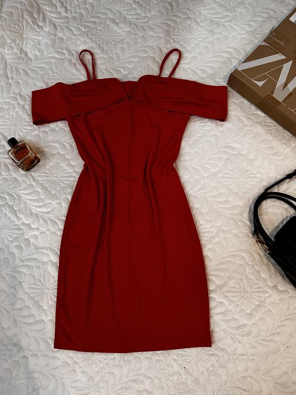 Яркое красное платье с приспущенными перчатками