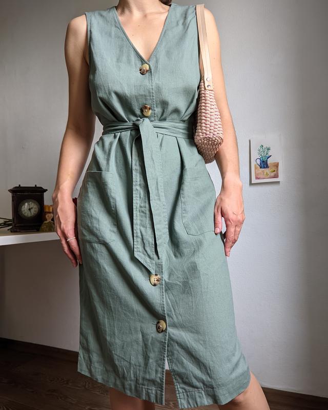 Платье халат на пуговицах миди прямое льняное лен зеленое серое карманы пояс футляр s m