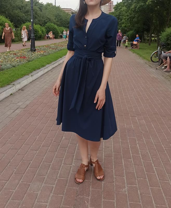 Плаття темно синього кольору. Матеріал: синтетика. Розмір: М Дуже легеньке й зручне. Ношене, але дефектів мінімум, крім потертості на шиї. Матеріал не мнеться.