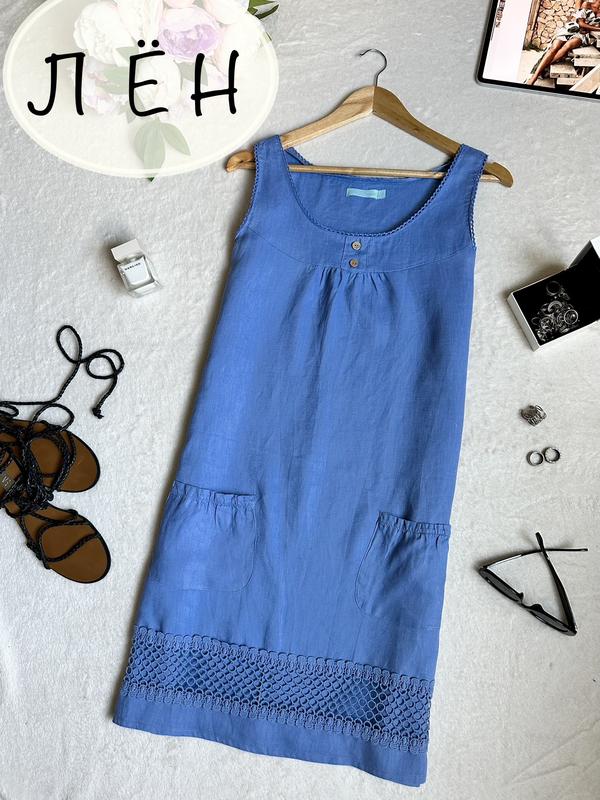 P12 Блакитне лляне плаття з мереживом! Абсолютно Нове, без паперової бирки Joe Browns (на сайті плаття від 3500 грн за бавовна, льон ще дорожчий) 12(40) (L) можно Xl. Дивіться заміри НО груди 50 см, максимум 54 см НО талія 54 см НО стегна 56/57 см Довжина 93 см Без підкладки, з пояском, можна зав'язувати навколо талії або тільки ззаду, а можна носити як пряме 685 грн ( неймовірна низька ціна за льон цієї фірми)