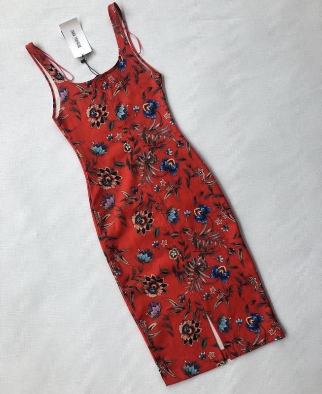 Красное платье миди по фигуре в цветы Zara Размер S, можно XS, смотри замеры Полуобъем груди 33 см Полуобъем талии 28 см Полуобъем бедер 37 см