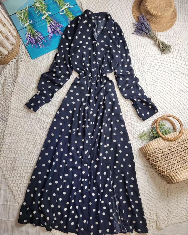 Черное длинное платье в горох Stradivarius, В идеальном состоянии Вискоза штапель Р. С Длина 128 В пояс 40 Плечи 40 Рукав 63 Бицепс 17 Пог 48 Пот 37 Стегна 53+