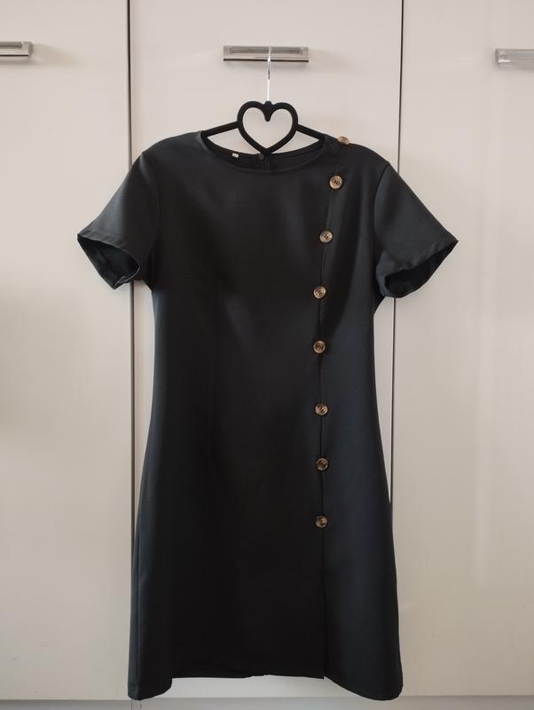 Платье с интересными пуговицами, сзади застегивается на молнию, спереди есть маленький разрез. Ориентируйтесь на замеры. Плечи 37 ПГ 46 ПТ 41 ПБ 48 Рукав 17 Длина 90
