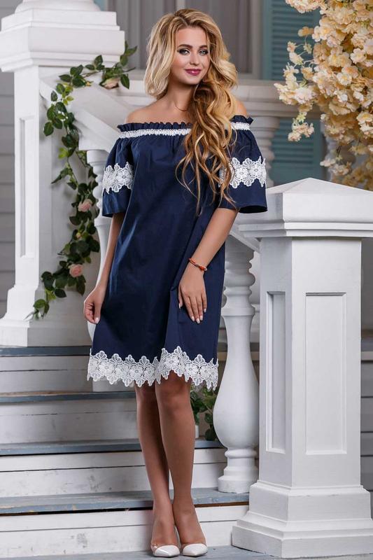 Платье глубокого темно-синего оттенка из коллекции Flower Print of Summer - стильное и практичное решение для жаркой летней погоды. Изделие сшито из стрейч-коттона. Материал практичен в носке и является приятным на ощупь. Насыщенный и умеренно-строгий оттенок модели делает возможным ее использование для создания офисных образов и повседневных аутфитов. Платье расширено к низу и имеет свободный покрой. Ткань красиво драпируется в области бедер, скрывая, тем самым, незначительные недостатки фигуры и подчеркивая ее достоинства. Рукав платья имеет короткую длину и слегка расширен к низу. Благодаря этому оно идеально подходит для носки в самую жаркую погоду. Модель с кокетливо открытыми плечами и горловиной, собранной по рюше на резинку изящно подчеркивает красоту обнаженных рук и плавные линии зоны декольте. При разработке платья дизайнерами было принято решение украсить его нежным кружевом. Этот вариант декоративной отделки придает образу, созданному с помощью этой модели, легкие этнические нотки. Платье темно-синего насыщенного оттенка можно носить с темными или контрастными светлыми туфлями и босоножками.